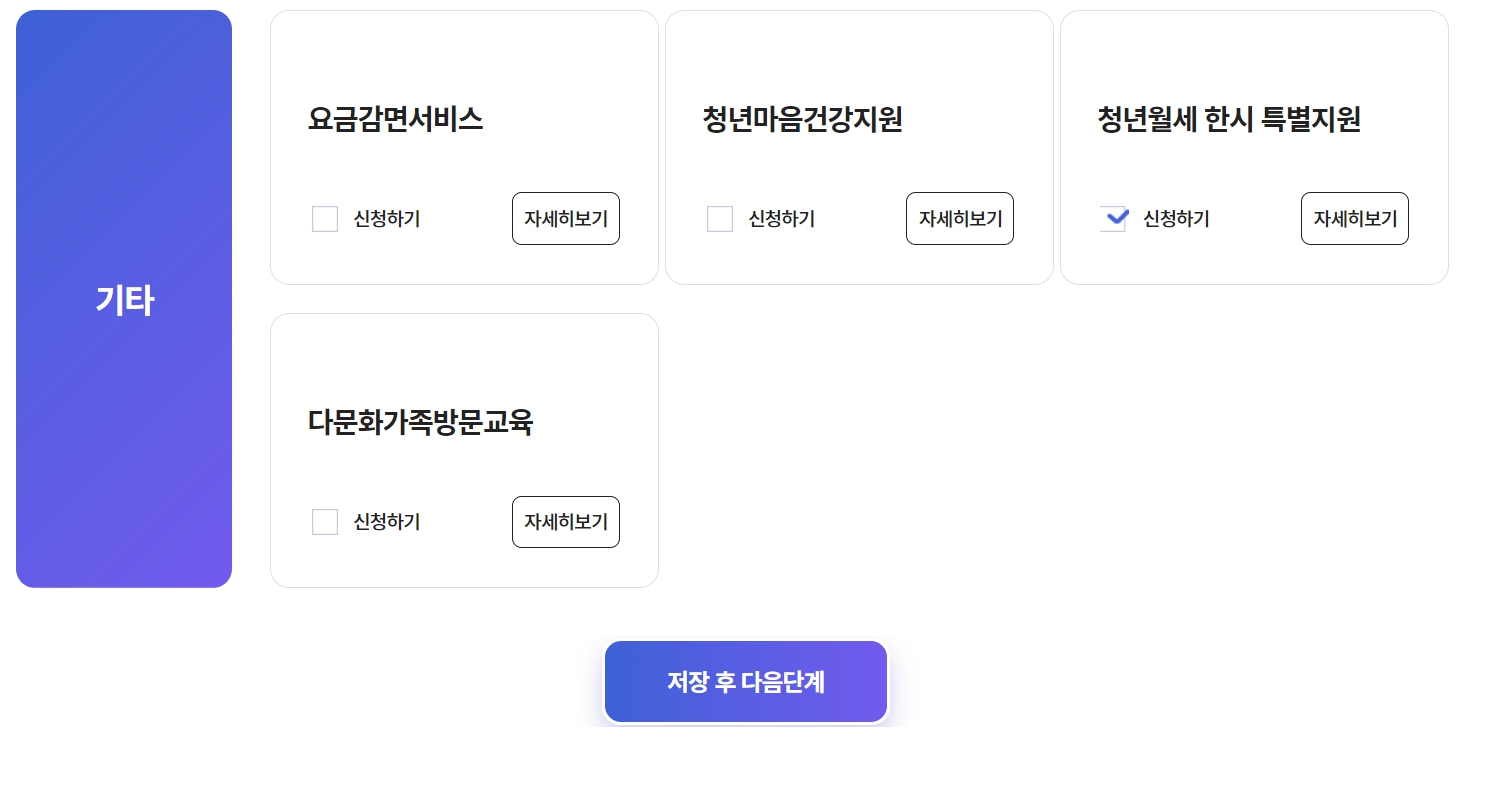 복지로 로그인 -> 서비스 신청 -> 복지서비스 신청 -> 복지급여 신청 -> 기타 -> 청년월세 한시 특별지원(아래링크 클릭)
